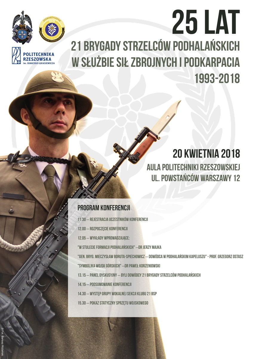 20 kwietnia br. w auli Politechniki Rzeszowskiej o godz. 12:00 rozpocznie się konferencja „25 lat 21 Brygady Strzelców Podhalańskich w służbie sił zbrojnych i Podkarpacia”. Politechnika Rzeszowska jest partnerem wydarzenia.