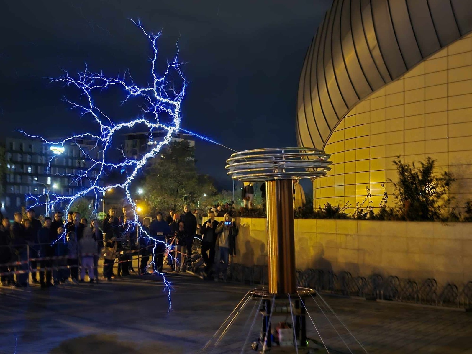 Najbardziej wyczekiwaną atrakcją Nocnych Spotkań z Nauką był „Teatr wysokich napięć”. Do tego widowiskowego spektaklu wykorzystany został jeden z największych w swojej klasie transformatorów Tesli. Kilkumetrowe wyładowania, które w rytm muzyki rozświetlały mrok, wzbudziły zachwyt widowni.