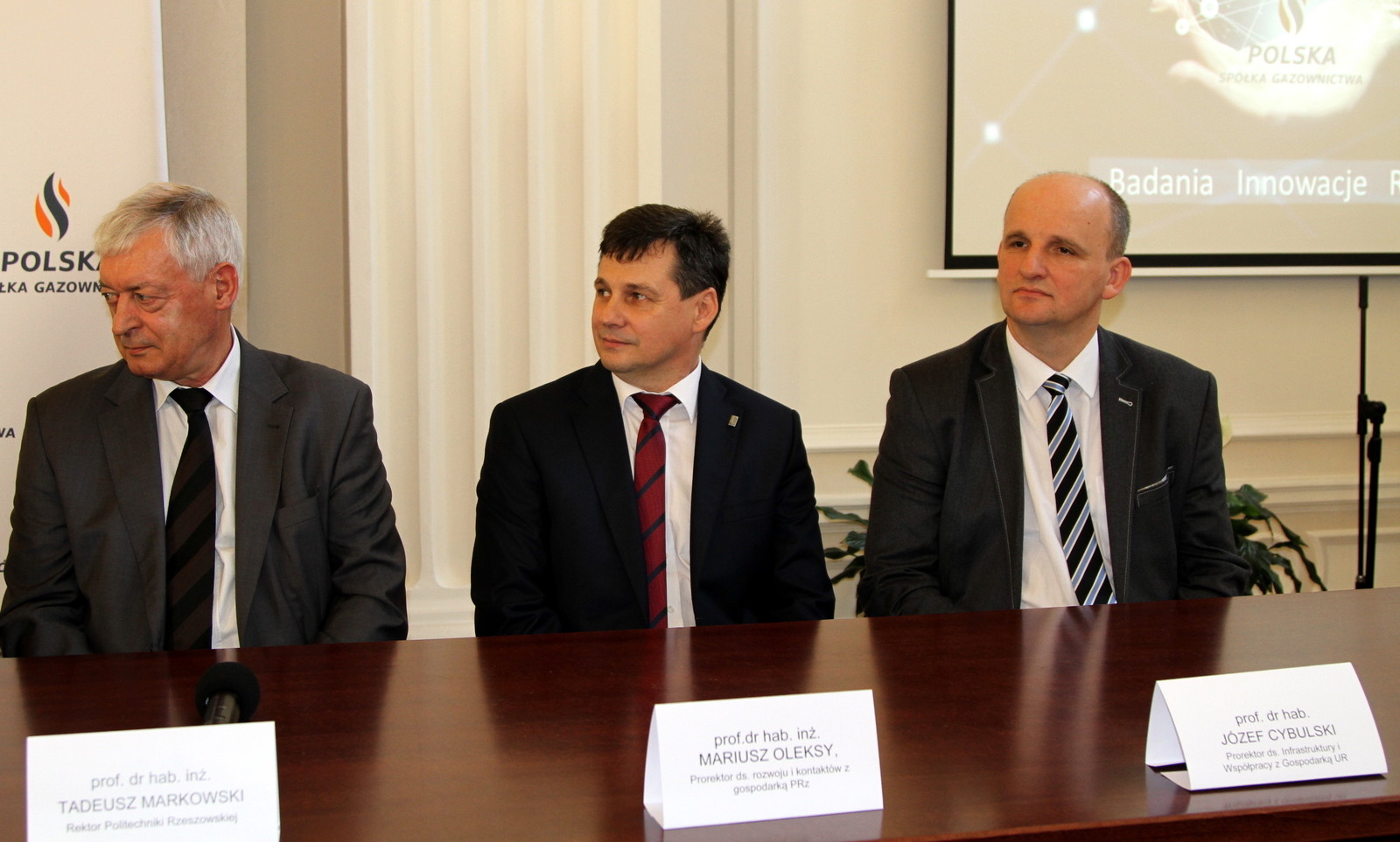 13 czerwca br. rektor PRz prof. dr hab. inż. Tadeusz Markowski i prorektor ds. rozwoju i kontaktów z gospodarką dr hab. inż. Mariusz Oleksy, prof. PRz, wzięli udział w konferencji Zarządu Polskiej Spółki Gazownictwa. Wydarzenie odbyło się w Podkarpackim Urzędzie Wojewódzkim w Rzeszowie. W spotkaniu, podczas którego omawiano projekt powołania Centrum Badań i Rozwoju, uczestniczyli: sekretarz stanu w Ministerstwie Nauki i Szkolnictwa Wyższego Aleksander Bobko, posłowie na Sejm RP Halina Szydełko i Wojciech Buczak, wojewoda podkarpacki Ewa Leniart, marszałek województwa podkarpackiego Władysław Ortyl, prezes Zarządu Polskiej Spółki Gazownictwa Jarosław Wróbel oraz prorektor ds. infrastruktury i współpracy z gospodarką dr hab. Józef Cebulski, prof. UR.