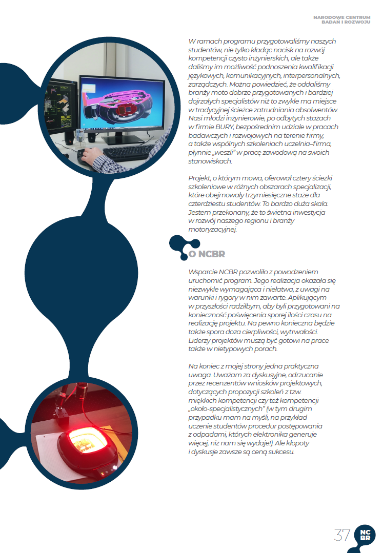 Projekt realizowany był w ramach ścisłej współpracy z firmą Bury z Mielca. Bury Mielec jest dostawcą rozwiązań w zakresie elektroniki użytkowej dla takich potentatów z branży motoryzacyjnej jak: grupa Volkswagen, Audi, BMW i Mercedes. Głównym celem projektu było nabycie i rozwój kompetencji oraz kwalifikacji kluczowych dla branży motoryzacyjnej przez 40 studentów i studentek drugiego stopnia studiów stacjonarnych kształcących się na kierunku elektronika i telekomunikacja. Projekt spotkał się z ogromną aprobatą i zainteresowaniem oraz aktywnym udziałem w wykładach prowadzonych przez firmę Bury a także w szeregu szkoleń organizowanych w ramach projektu.