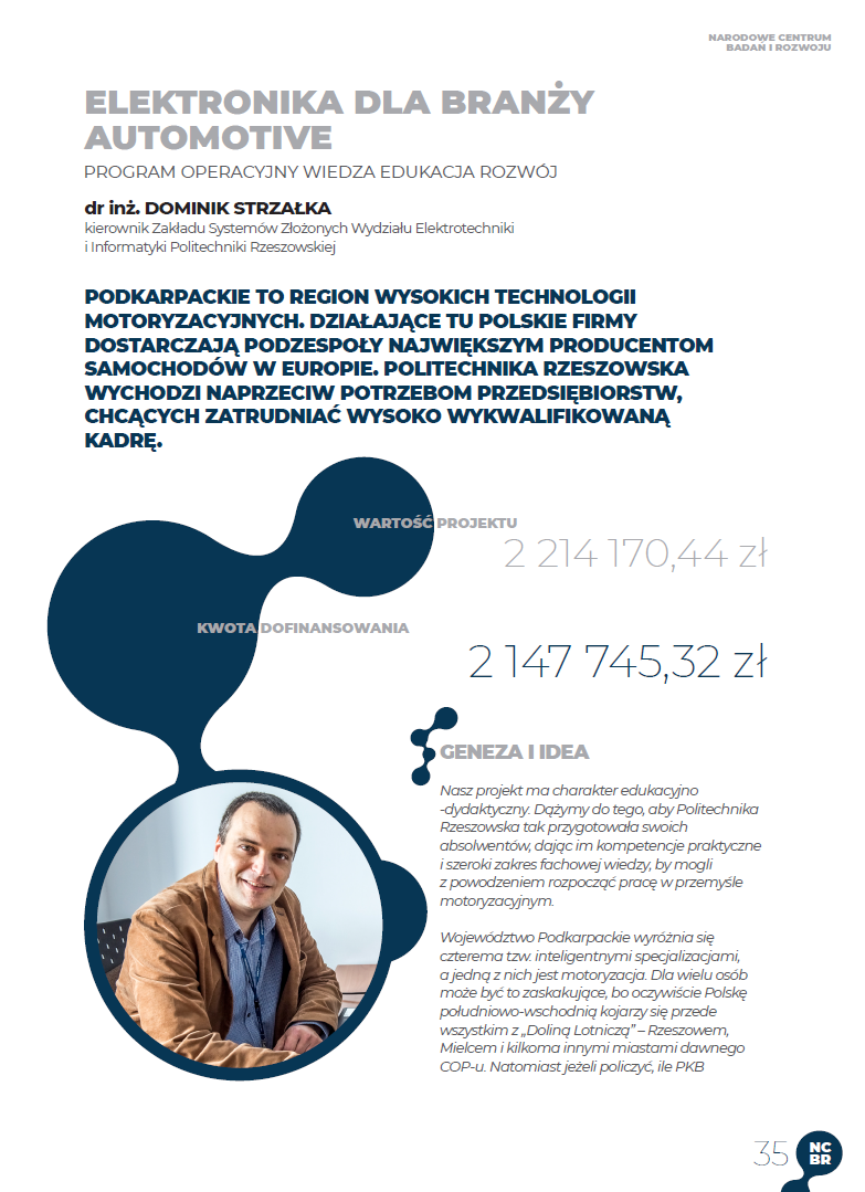 W okresie od 1 stycznia 2018 r. do 31 października 2019 r. Wydział Elektrotechniki i Informatyki Politechniki Rzeszowskiej realizował projekt o charakterze edukacyjno-dydaktycznym pn.: „Elektronika dla branży automotive” pod kierownictwem dr. inż. Dominika Strzałki, prof. PRz – kierownika Zakładu Systemów Złożonych. Projekt został zorganizowany w ramach konkursu ogłoszonego przez Narodowe Centrum Badań i Rozwoju na projekty wspierające rozwój kadr dla przemysłu motoryzacyjnego. Wartość projektu wynosiła 2 214 170,44 zł, natomiast kwota dofinansowania 2 147 745,32 zł.