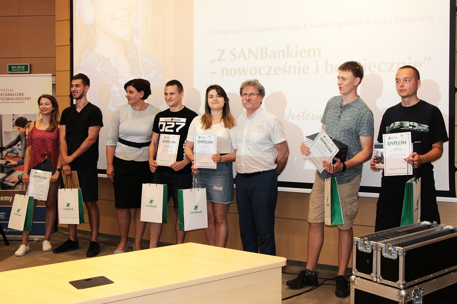 Konkurs „Z SANBankiem – nowocześnie i bezpiecznie” został zorganizowany 17 czerwca na Wydziale Mechaniczno- Technologicznym PRz w ramach obchodów Święta Spółdzielczości Bankowej 2019. Do konkursu przystąpiło 41 dwuosobowych drużyn, które odpowiadały na 21 pytań. Na uzyskane wyniki wpływ miała nie tylko poprawna odpowiedź, ale również refleks. Za złą odpowiedź punkty były odejmowane. O finalnym wyniku zadecydowało ostatnie pytanie, które zmieniło tabelę wyników.