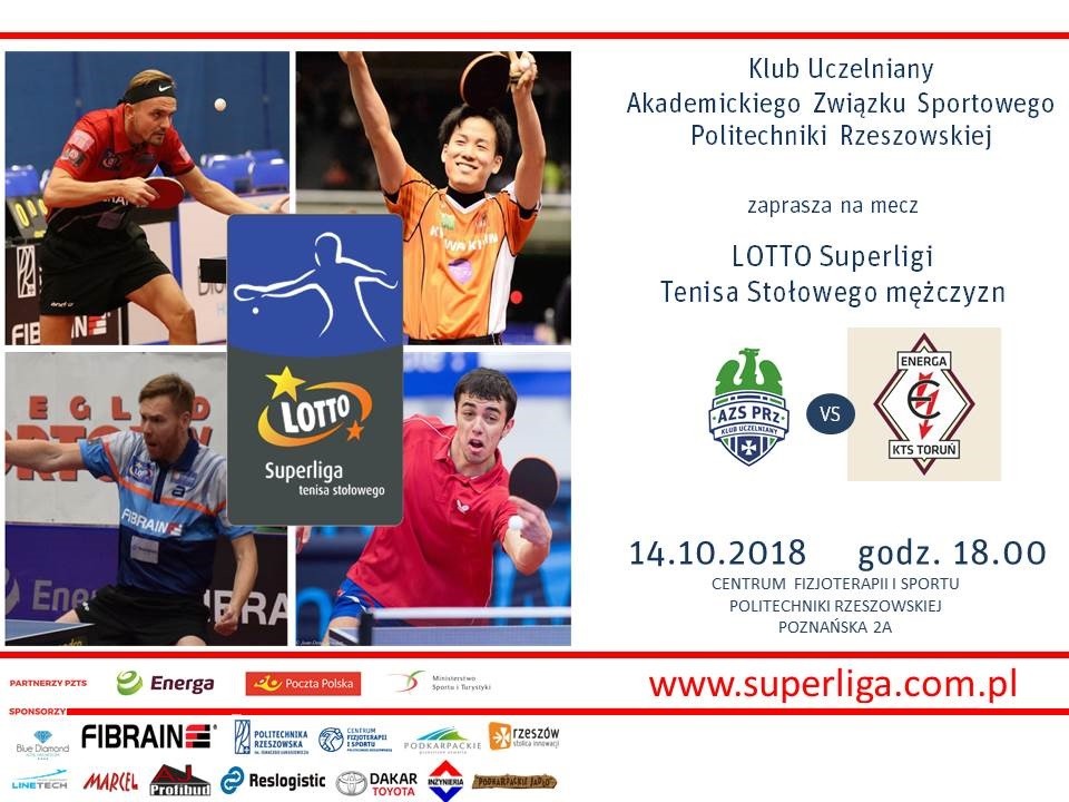Klub Uczelniany Akademickiego Związku Sportowego Politechniki Rzeszowskiej zaprasza na mecz LOTTO Superligi Tenisa Stołowego Mężczyzn .